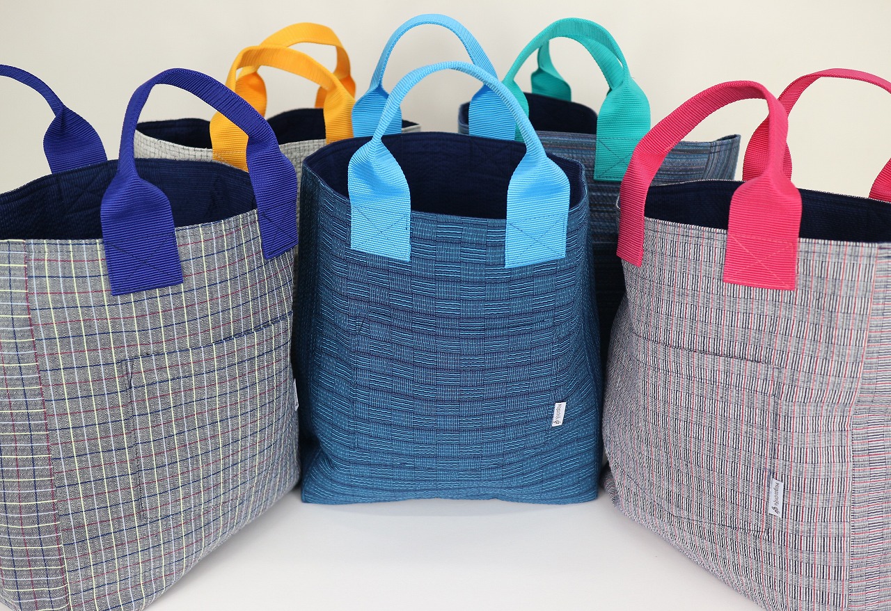 徳島の地域ブランドである「阿波しじら織」でトートバッグを作りました。カラフルなハンドルがアクセントになっています。軽くて持ちやすく、日常使いに最適なバッグです。
