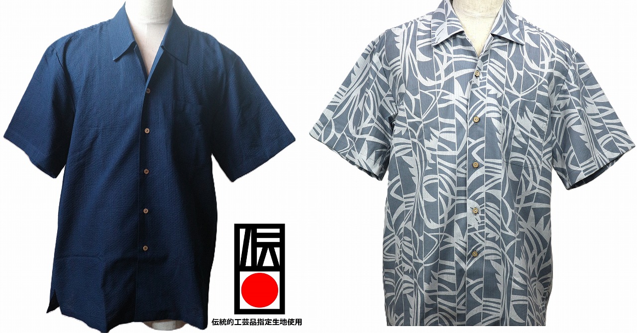 左:伝統的工芸品指定の「阿波正藍しじら織」で仕立てたラグジュアリーなアロハシャツです。「阿波正藍しじら織」とは、糸を一から藍で手染めして織り上げた、藍染のしじら織です。糸の準備から最終仕上げまで全ての工程を自社で行っております。しじら織の持つ生地表面のシボ(凹凸)のおかげで、軽くてさわやかな肌触りで、暑い夏に最適です。落ち着いた色目が上品です。