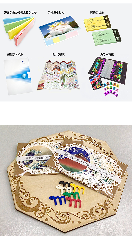 伝票、偽造防止加工、可変印字(No./QR/音声コード)医薬品関連資材をはじめ、豆本・色紙・付箋などのノベルティ関連まで、幅広いニーズに対応。