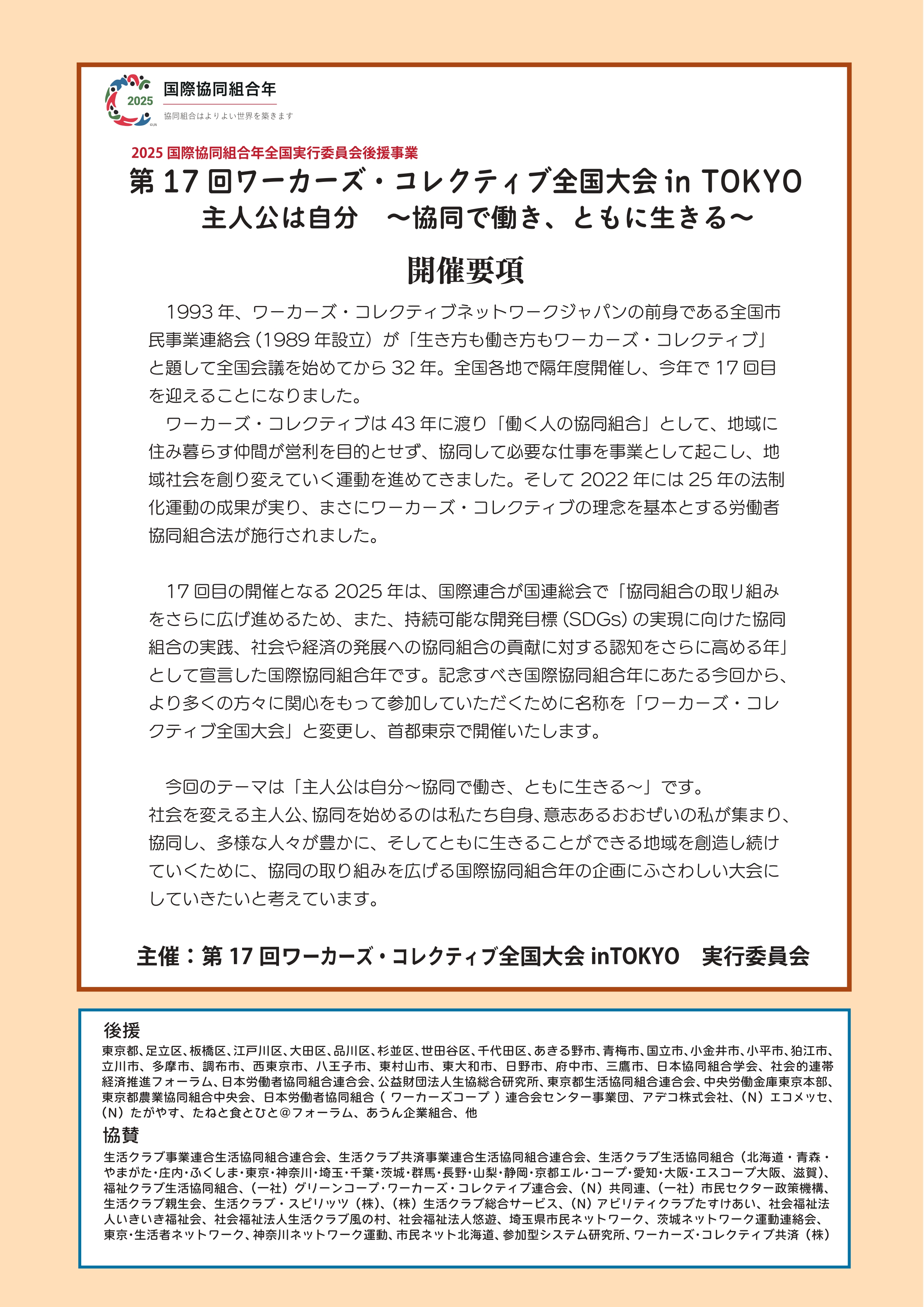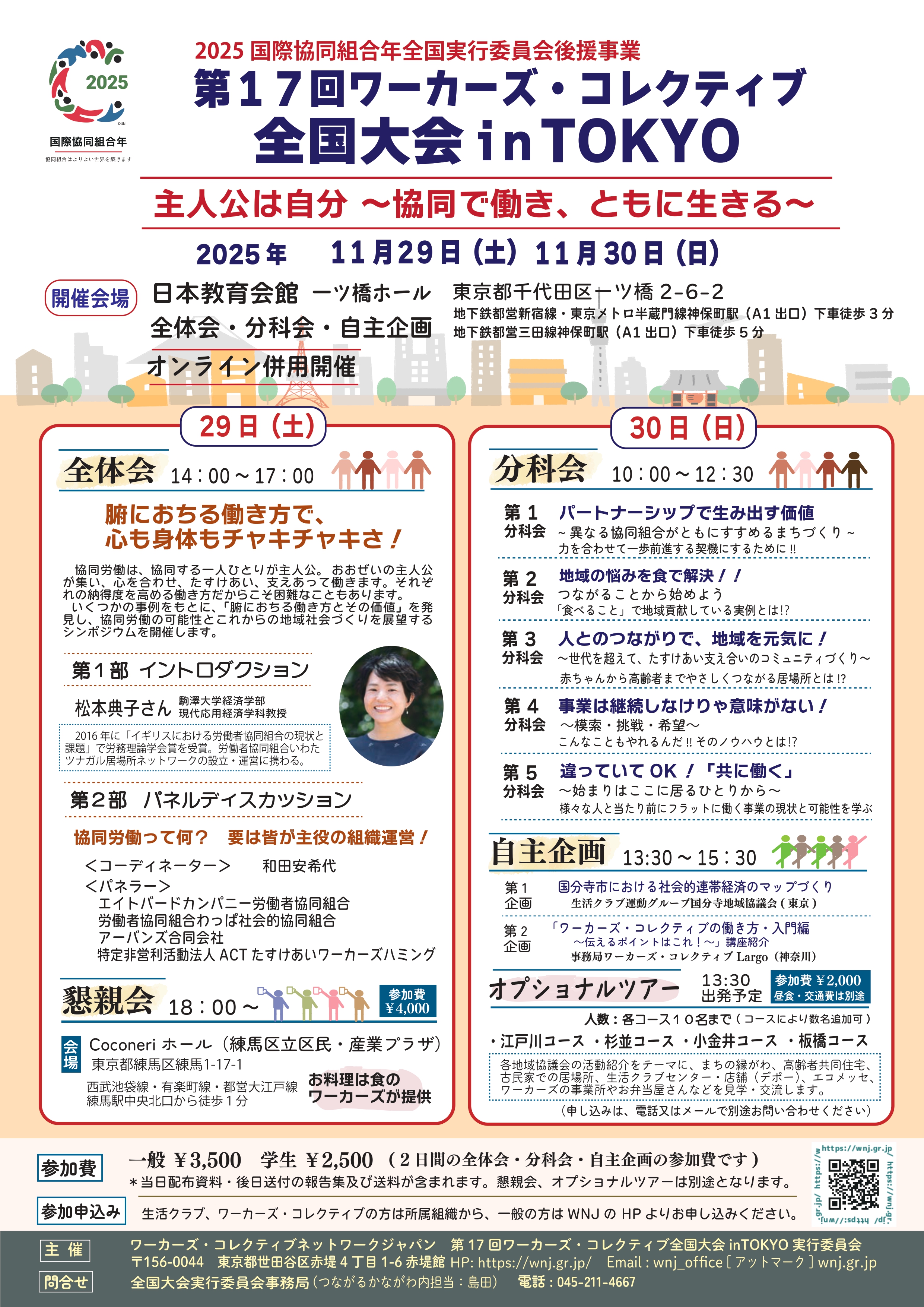 東京ワーカーズ・コレクティブ協同組合は、東京を拠点に事業を展開するワーカーズ・コレクティブが組合員となって、互いの事業発展のために、出資し運営も担っている事業協同組合です。ワーカーズ・コレクティブは働きたいという意思のある人が参加し、協同の精神でつくりあげてきた働く人の組織です。 今年は、11月29日(土)・30日(日)の二日間にわたり、日本教育会館にて、第17回ワーカーズ・コレクティブ 全国大会 in TOKYOを開催します。 「協同労働」を実際に行っている事業者が、実際の面白みを話します。
