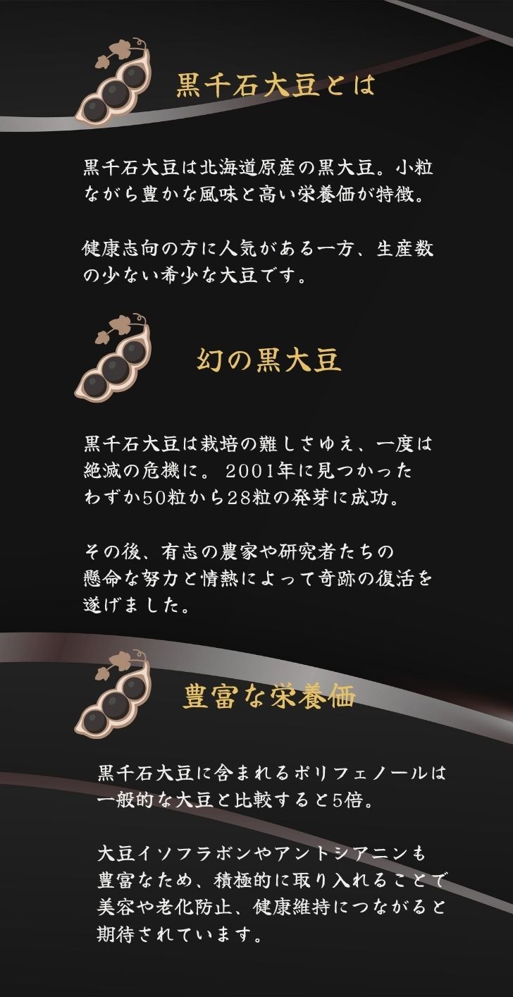 皮の固い幻の黒千石大豆を丸ごと食べられるようポン菓子加工しました。そのままおやつに、豆ごはん、お茶としても召し上がれます。