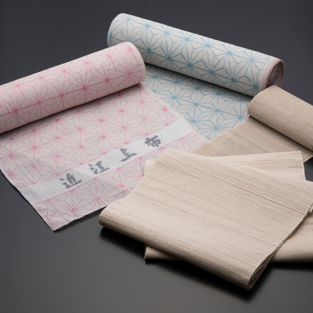 滋賀県湖東地域の麻織物の歴史は室町時代に遡ります。近江上布は風通しが良く、涼しく軽やかな最高級な夏の衣料です。近江上布には室町時代の技術をほぼ受け継ぐ生平と近江特有と言われる染色技術を使った絣があります。使われる原料は、日本古来の麻、苧麻と大麻です。特に生平に使われる大麻は他の伝統工芸の麻織物には使われておらず、近江の伝統ともいえます。