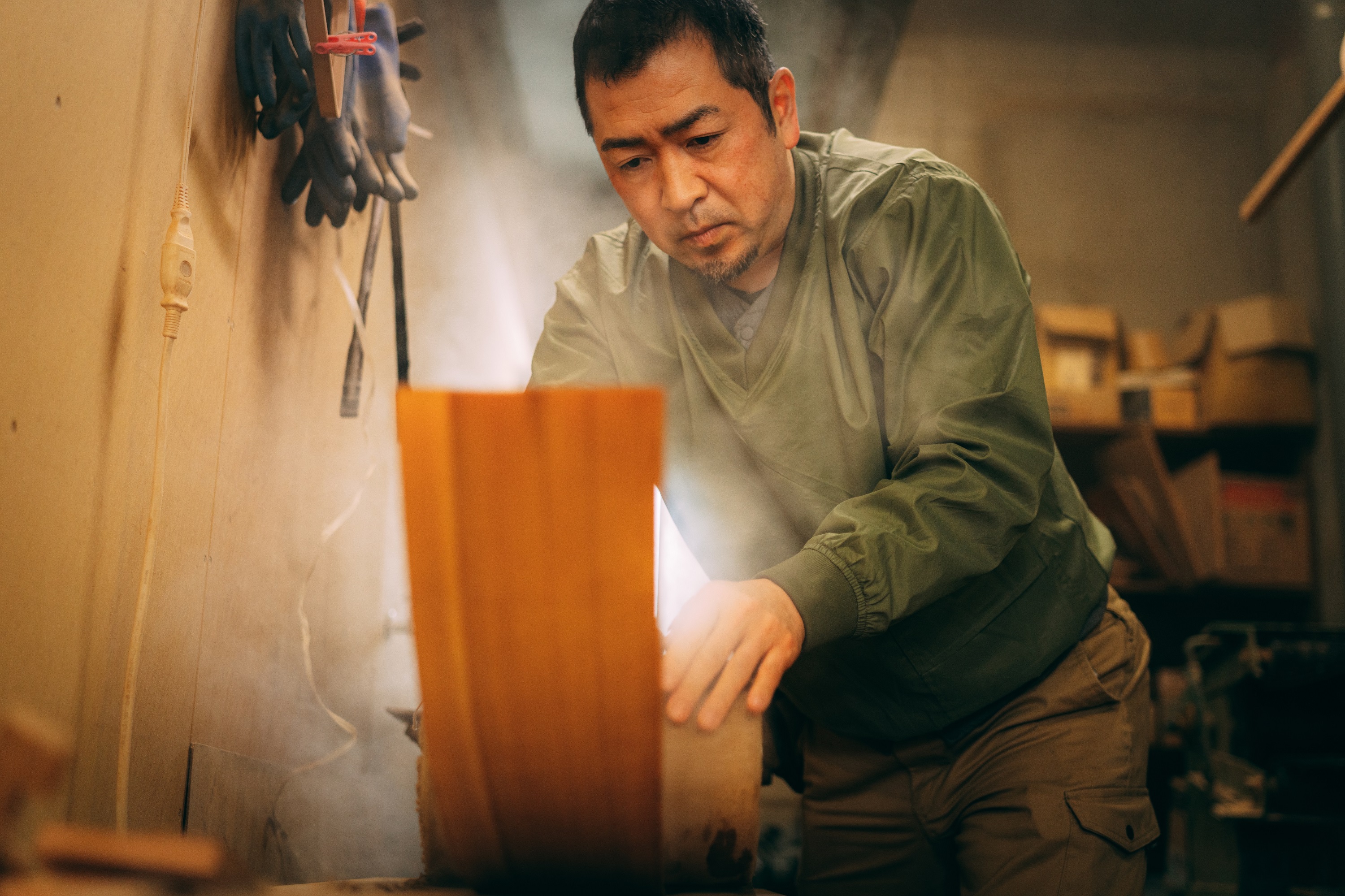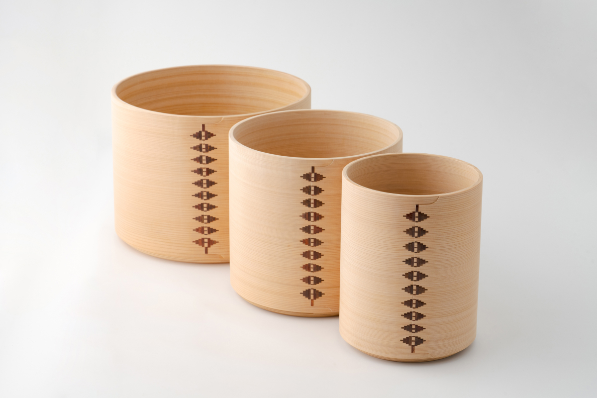 いつかお茶道具を作るためにと、長年大切に保管していた材料を使用しています。今後手に入らないかもしれない材料だからこそ、今がチャンスと、その魅力を最大限に生かして製作されました。幅七寸の柾目板を正円に曲げる技術は高度な技術を必要とします。天然秋田杉の繊細なまでに細かな柾目には、秋田の厳しい自然のなかでじっくりと育まれてきた年月が刻み込まれております。正面の山桜は厄除けの願いを込め、両鱗綴じを施しました。