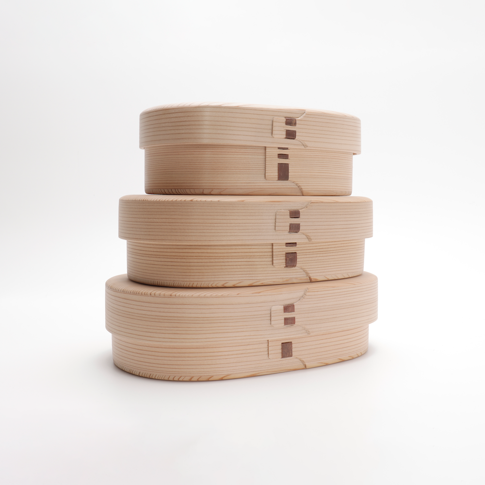 馴染みあるふくよかな小判型のお弁当箱は大・中・小の3サイズを展開しております。小サイズはお子様から大人の女性のお客様にも人気のサイズです。成人のお客様からのご注文がもっとも多いのは中サイズです。大サイズは沢山召し上がりたい方にご満足いただけるサイズと思います。