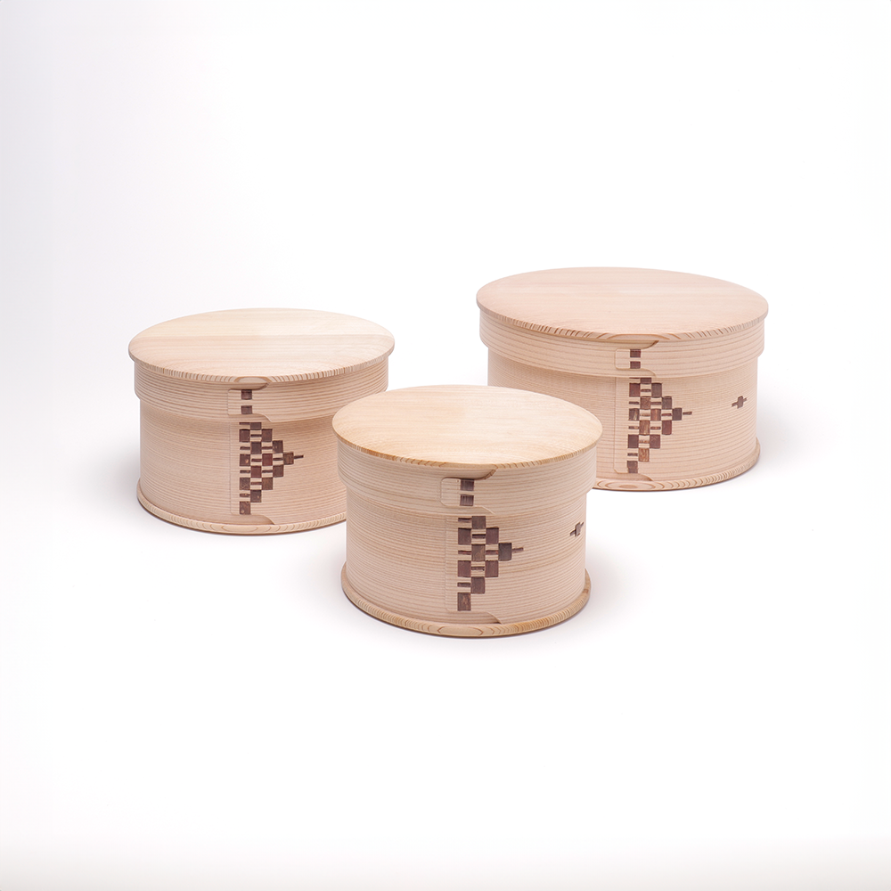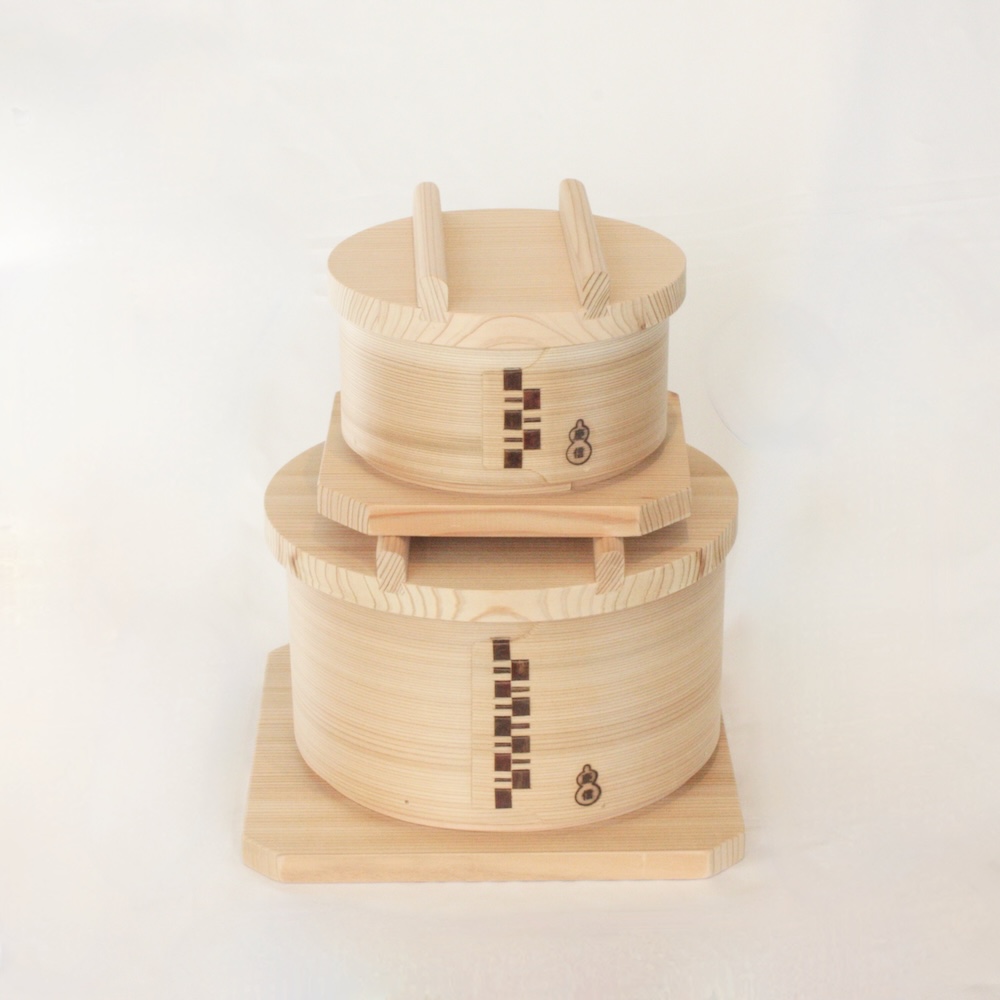 白木(無塗装)製品は、調湿効果により時間が経ってもご飯がべとつかず、抗菌効果があるので傷みにくいのが特徴です。厚みのある曲げに山桜の木皮で厄除けの意味合いがある「鱗(うろこ)」模様に綴じ、ロクロの技を取り入れて底板の隅を丸くとっており隅にご飯が入り込んでしまうことなく手入れも簡単です。