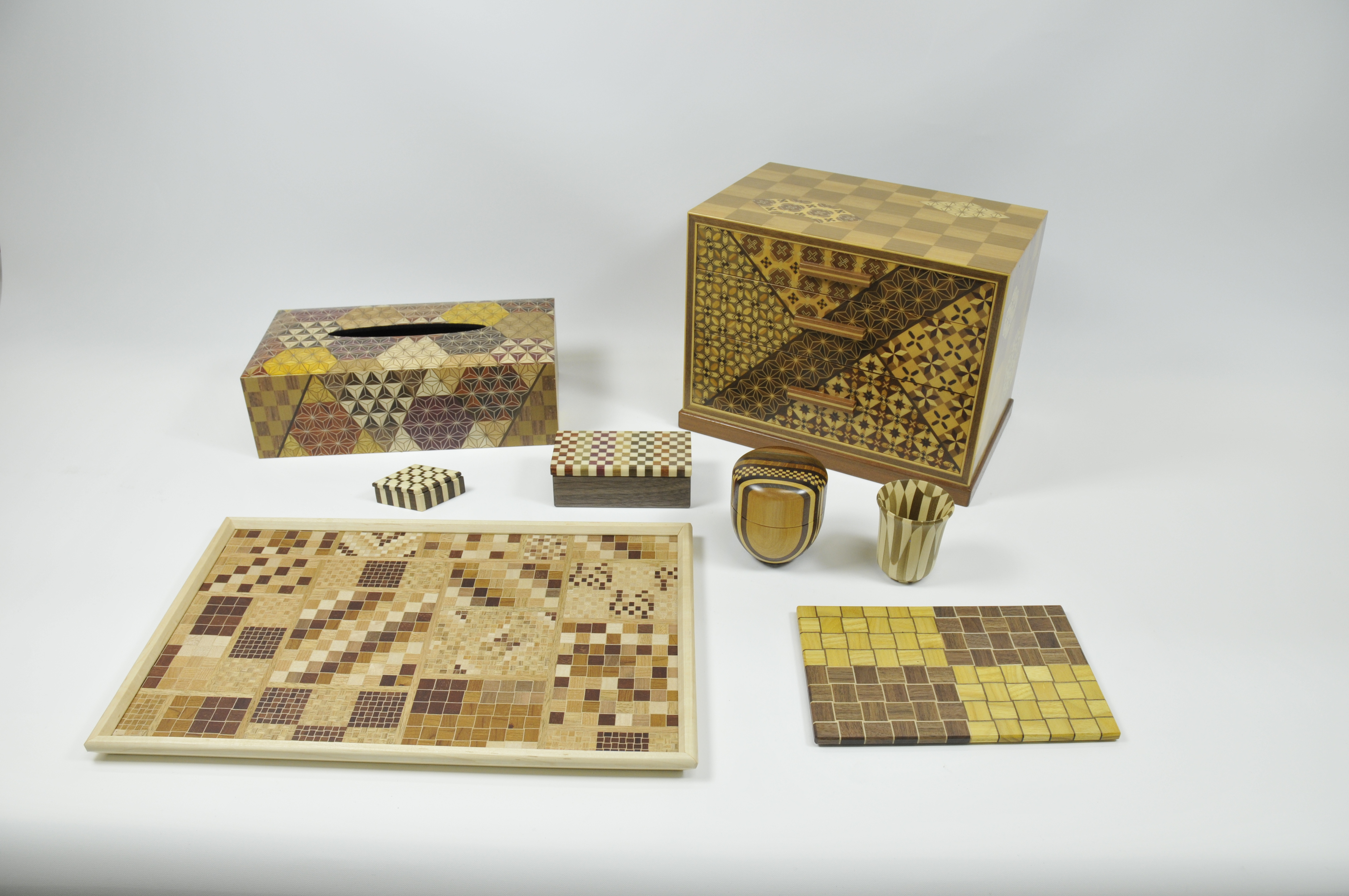 箱根の豊富な樹種が持つ自然の色合を生かして、幾何学紋様を作り上げたものが寄木細工の始まりです。この技法は江戸時代末期に箱根畑宿の「石川仁兵衛」が創作したと言われています。当初は、乱寄木や単位寄木文様が主流でしたが、機械や加工方法の発達とともに、現在では緻密でさまざまな模様の寄木細工が作られています。