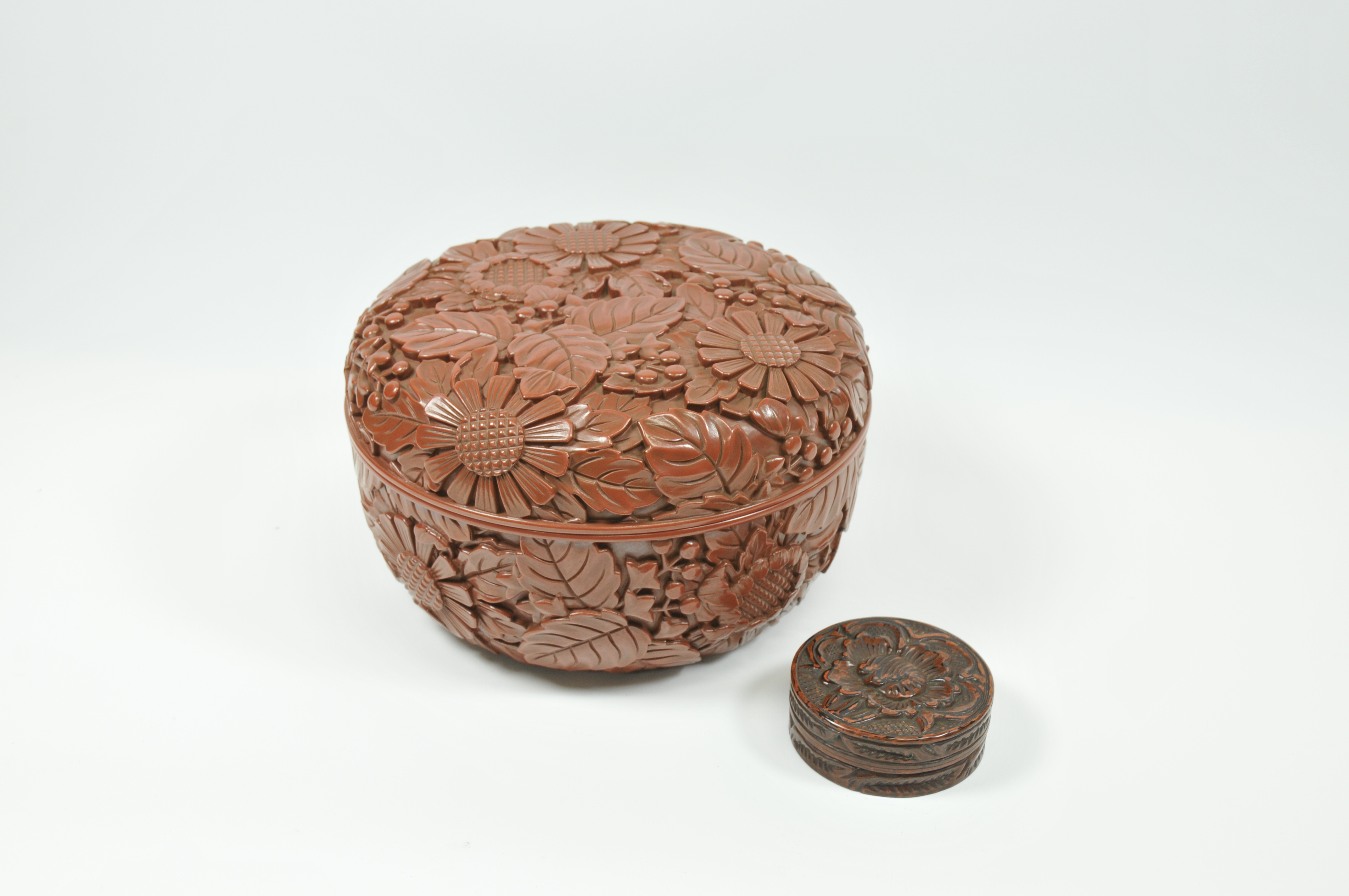今から800年ほど前、鎌倉時代に中国から伝わった彫漆工芸品の影響を受けて、寺院の儀式具や調度品に木彫りの後、漆塗りをほどこし中国風に作ったのが始まりと言われています。その後、時代とともに茶道具や生活実用品を作るようになりましたが、技法は古来の製法と変わらず、刀痕の味を生かして花鳥などの題材をレリーフ状に彫刻した後、漆塗りを何回も繰り返して仕上げた堅牢な漆工芸品です。