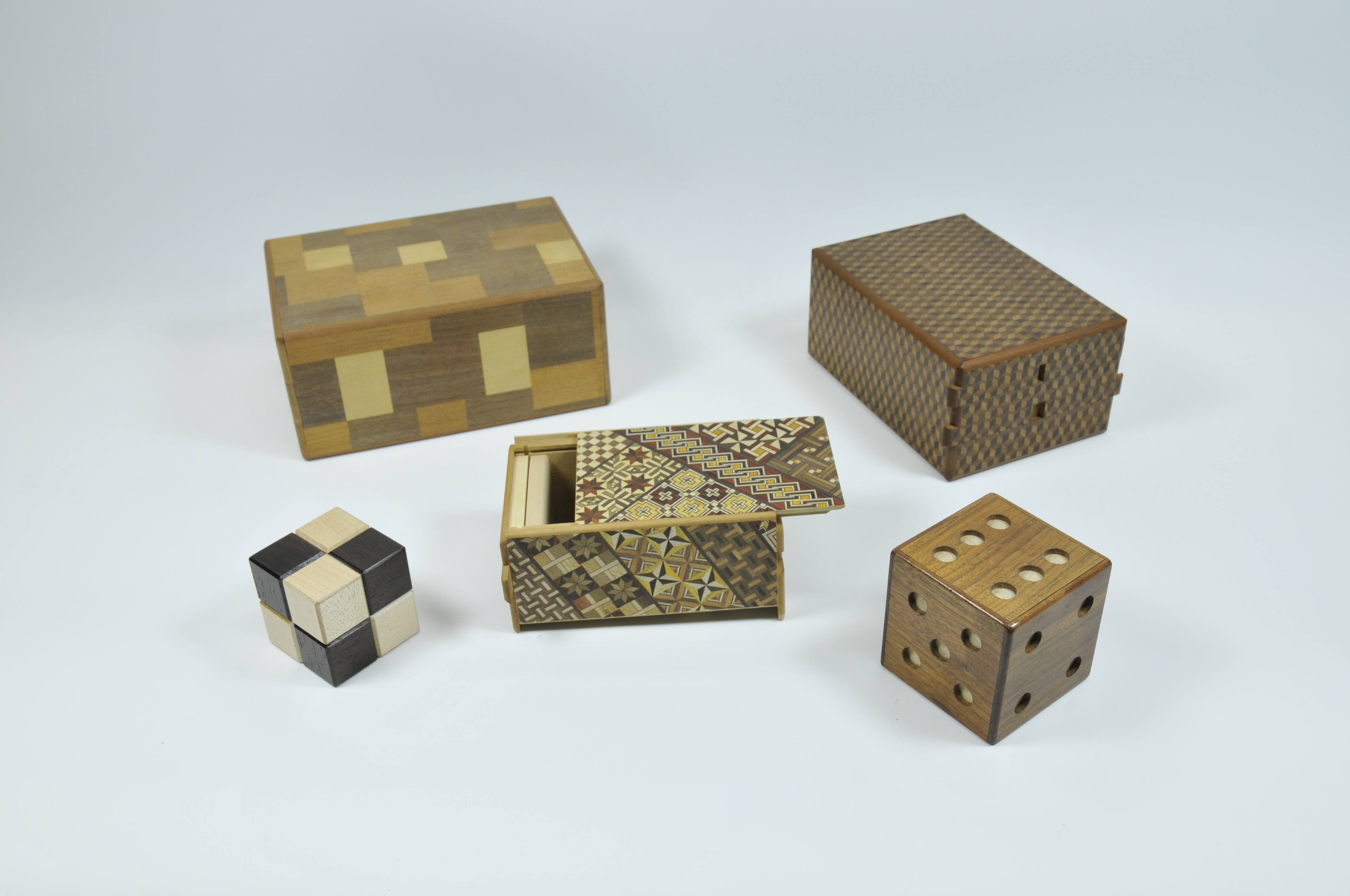 秘密箱の起源は明確ではありませんが、現在も引き継がれる仕組みの秘密箱は、今から百年以上も昔、1894年(明治27年)頃に箱根湯本の大川隆五郎によって創始されたと言われており、その伝統的なスタイルの秘密箱は、考案者の名前をかりて「大川式秘密箱」と呼ばれています。指物技法でパズル的な機構を組み込み、天地が解らないように工夫した箱で、特定の面を押したり引いたりして順序よく操作すると、初めて開けられる小箱です。