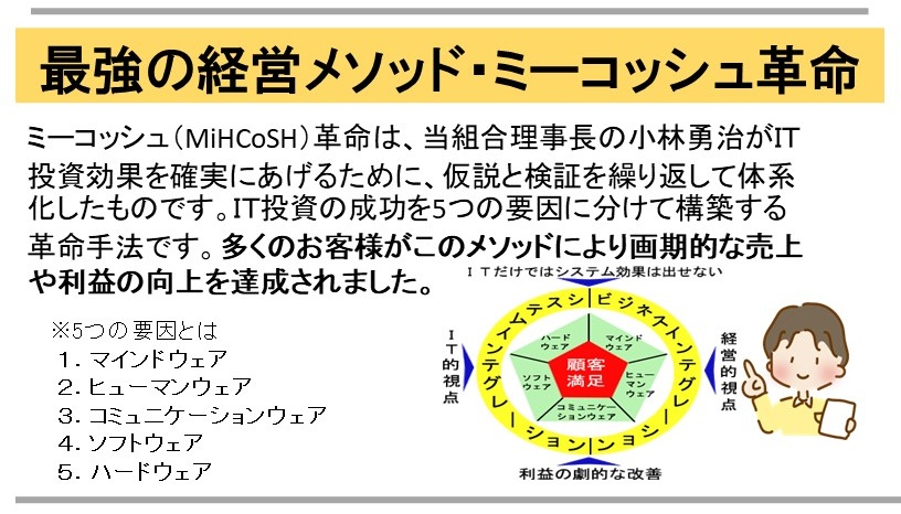 ミーコッシュ(MiHCoSH)革命は、当組合理事長の小林勇治がIT投資効果を確実にあげるために、仮説と検証を繰り返して体系化したものです。IT投資の成功を5つの要因に分けて構築する革命手法です。